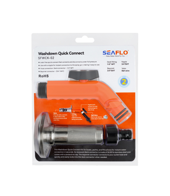 This Washdown Quick Connect Kit for boats yachts and RVs allows instant water connection in seconds. Its recessed deck connector is made of SUS316 stainless steel and comes with a protective cap. The bayonet connector connects to your outlet hose quickly and easily locks into the deck connector when needed.