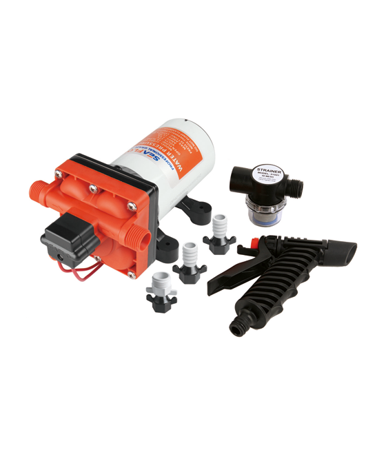 Our heavy-duty washdown kit. The best choice for cleaning boats, fish boxes, anchor wells, dinghies, and other similar applications. This pump boasts a huge 4.0 GPM capacity. This pump has an on-demand switch, so the pump automatically turns on when you squeeze the spray?gun handle. With 55 PSI cutoff, this has the pressure to get rid of stubborn debris. Suitable for fresh and saltwater applications.